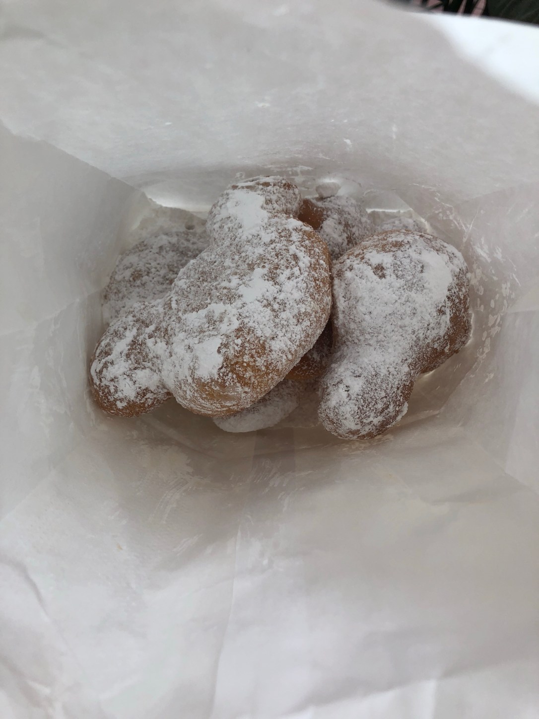 There are pretty much only 2 things on the menu: beignets and mint juleps. Now, there is no alcohol anywhere in the whole of Disneyland park, save for Club 33, so these were virgin mint juleps. We skipped those and just went for a bag of beignets. And they. were. amazing!