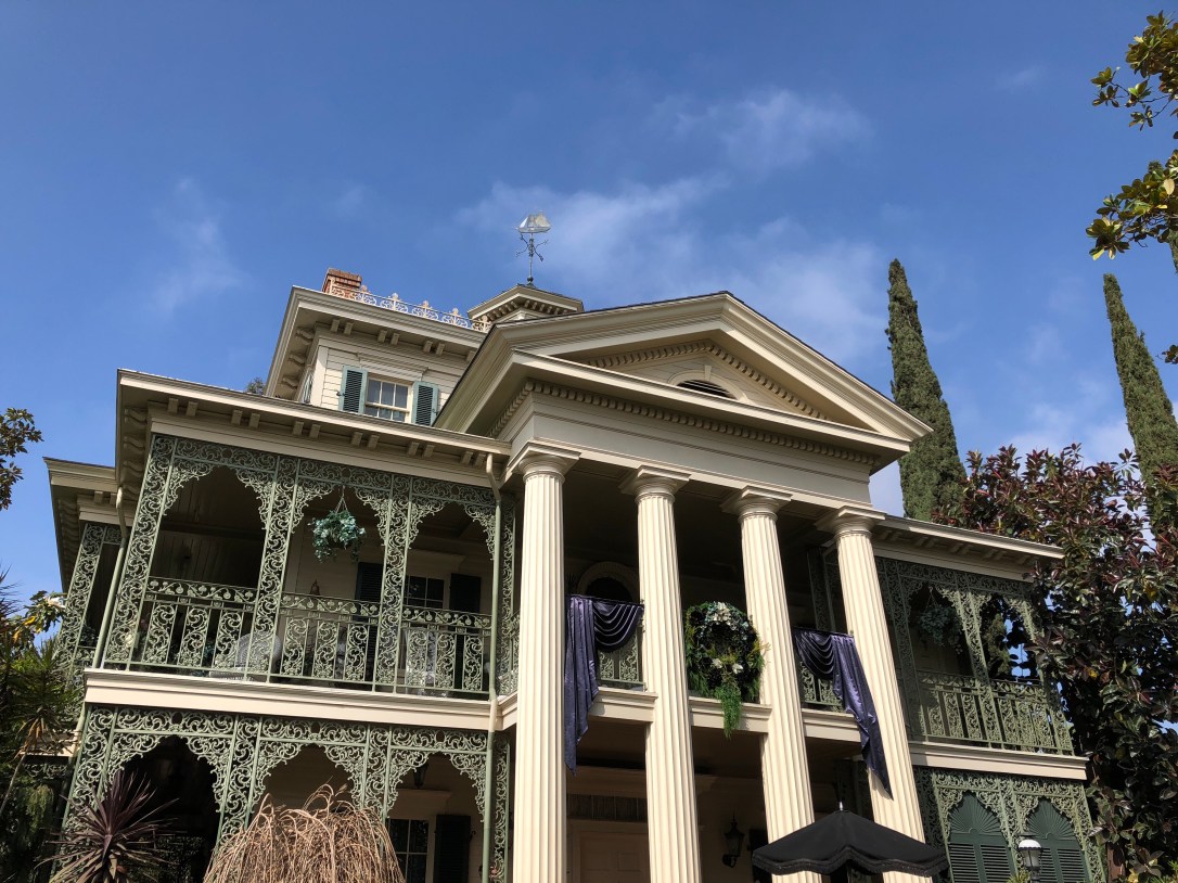 The outside is clearly very different from the Disney World one and it looks way more like a cool old mansion. The outside definitely doesn’t seem as spooky as the Florida one but I think it’s pretty.