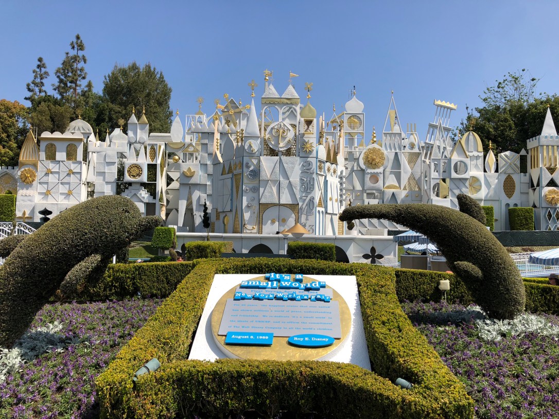 Even though I admittedly skip Small World pretty much every time I’m in Disney World, I knew of the amazing beauty of the ride in California and I really wanted to do as much as possible, so that’s what we snagged our next FastPass for. I’m really glad we had a FastPass because the wait was pretty long and it’s not a ride I really want to wait a long time for. The entire queue is outside and you even board the ride outside. The other big difference I noticed is a lot of easter eggs of other Disney characters that I don’t remember from the Florida version. It has been awhile, tho, so I may just not be remembering.