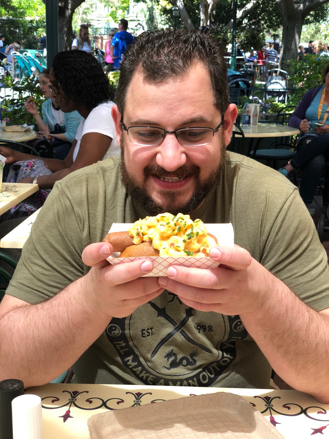 By this point, it was time for lunch. I’ve heard that Disneyland’s food game, especially snacks and quick service, far exceeds Disney World’s. So, unlike my usual over-planning, we decided we’d totally wing it for lunch. I went for a garlic cheddar bagel twist from Maurice’s Treats (right by the castle) and hubby got a lobster mac ‘n cheese hot dog from Harbour Galley (by Haunted Mansion). We took our treats over to the seating area by Mint Julep Bar and chowed down.