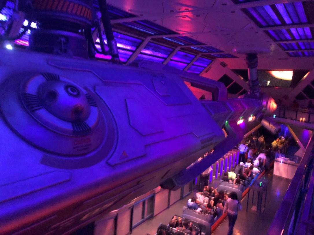 After Fantasyland, we made our way back over to Tomorrowland for our Space Mountain FastPass. This one is much different from the one in Disney World. For one, you sit side-by-side on this, which I was looking forward to. As much as I love roller coasters and LOVE the Disney World Space Mountain, neither my husband or I were big fans of this version. Hubby’s theory is because the lights on the ride are moving and you’re moving (as opposed to Disney World, where we’re pretty sure the lights on the ride track itself are stationery), it kinda made us feel a little funky, which usually only happens to me when I spin.
