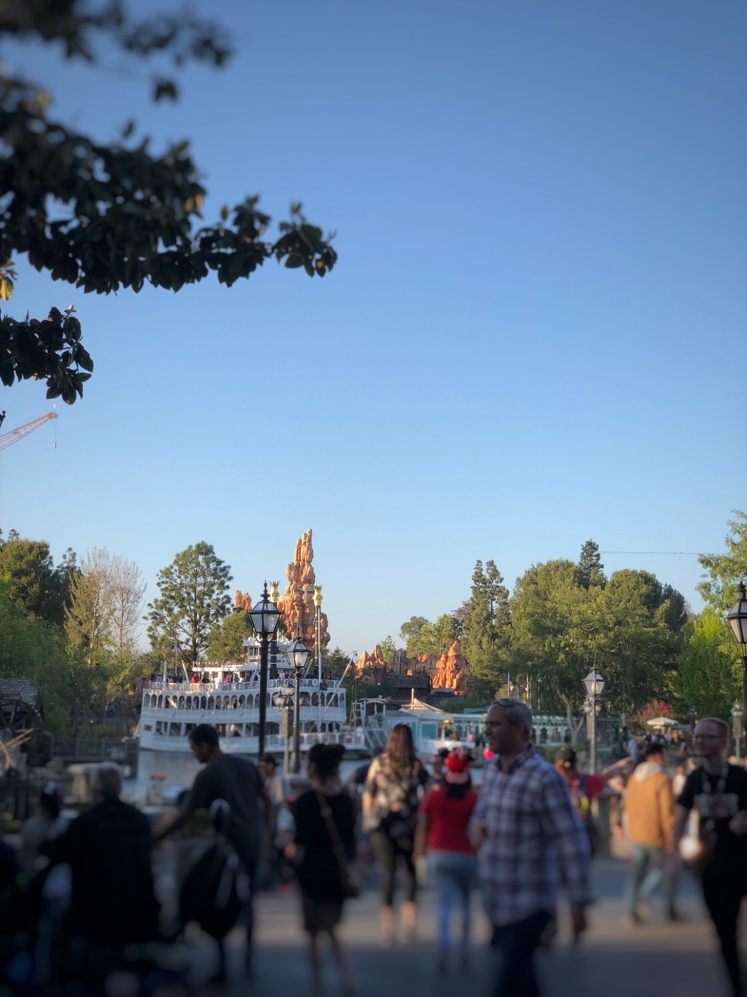 If I could have been given my choice of any table in the entirety of the restaurant, I’d have chosen the one we were seated at by chance. We were outside, all the way at the front, in the corner. My wonderful hubby sat with his back to the park so I could sit facing out, with a view of the River Boat and Thunder Mountain. The weather was perfect, cool but comfortable, and the sun was setting so everything had that perfect golden hour glow.